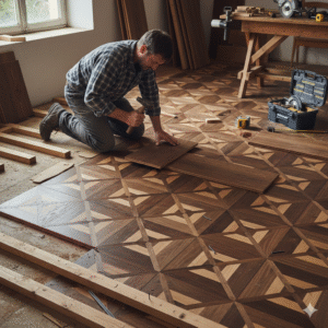 - Parquet mosaïque : Petites lamelles assemblées pour motifs géométriques, pose complexe nécessitant un artisan expérimenté.