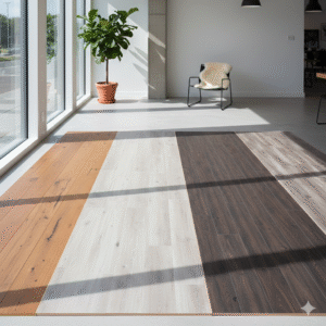 - Parquet stratifié : Imitation bois avec couche décorative + support HDF, économique, facile à poser, sensible à l’humidité.
