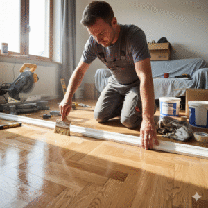 - Finitions : Pose de plinthes, vernissage ou huilage, inspection sous différentes lumières.